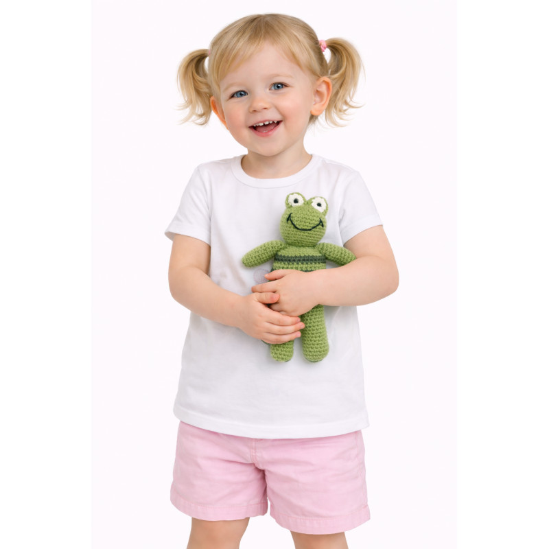 Käsin neulottu vihreä sammakko. Valmistettu Seitsemän Veljestä -langasta ja täytetty puhdasvanulla. Varustettu turvasilmillä (ei suositella vauvoille). Uniikki ja ekologinen valinta lahjaksi tai omaksi iloksi.