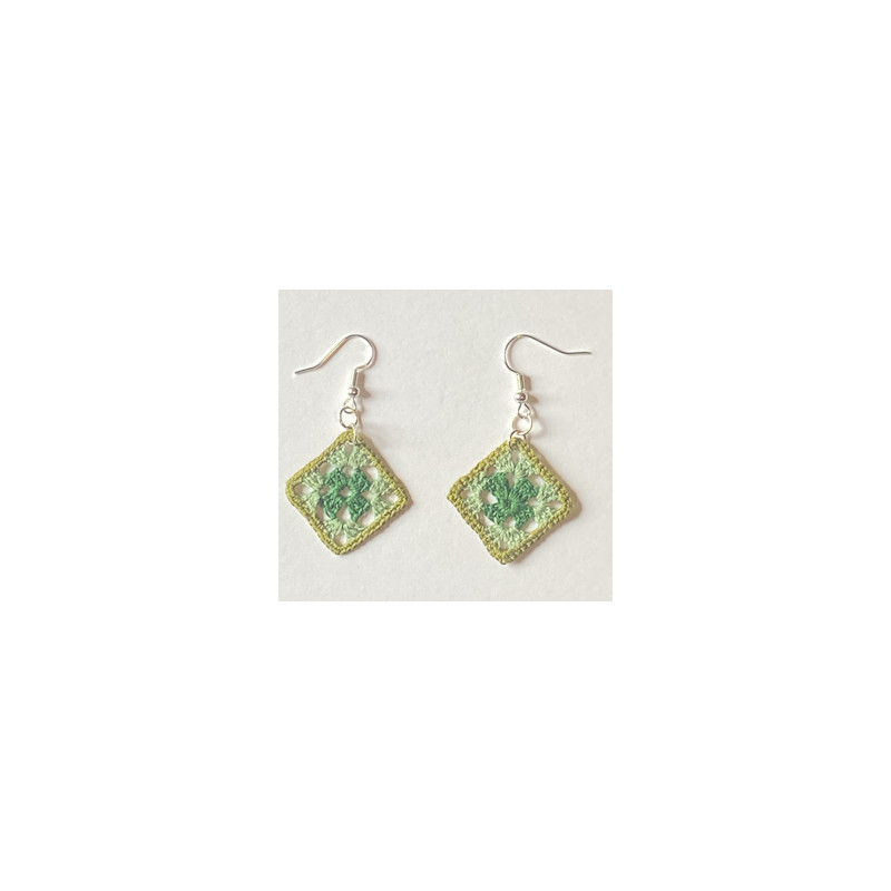 Käsin virkatut korvakorut, joissa yhdistyy raikas vihreä ja hillitty ruskean sävy. Korvakorut on valmistettu pienistä, neliön muotoisista virkkausmalleista, jotka muistuttavat perinteisiä mummon neliöitä. Kevyet korut sopivat niin arkeen kuin juhlaankin ja tuovat asuun ripauksen persoonallista käsityön tunnelmaa.