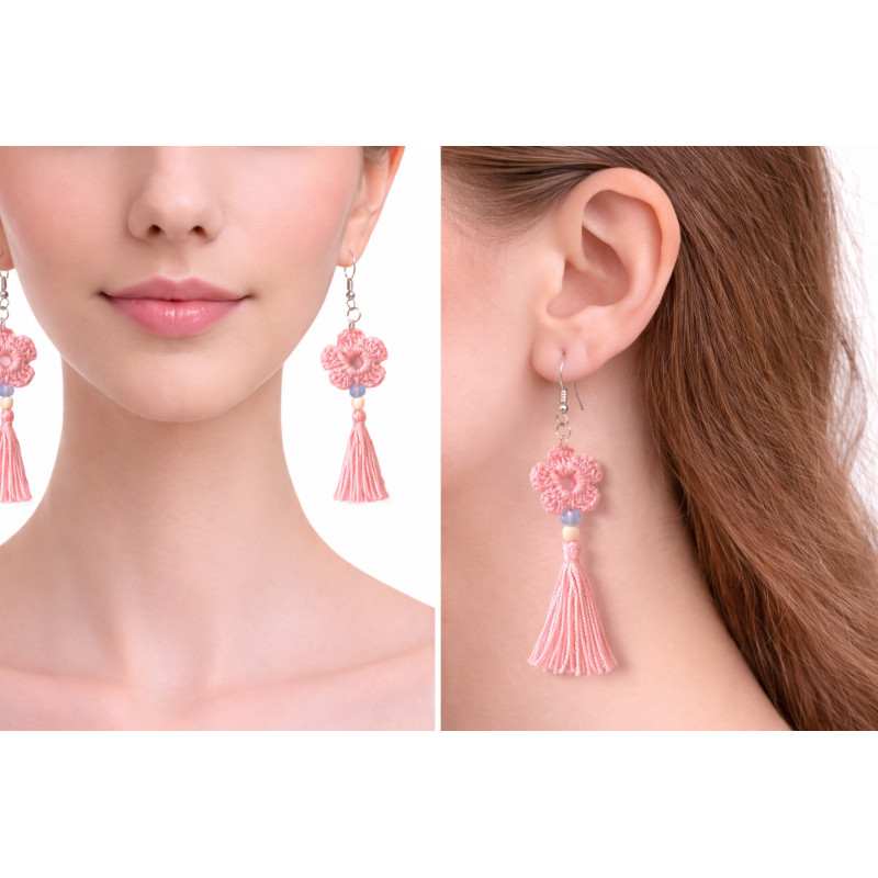 Herkkä ja iloinen käsityönä virkattu korvakorupari, jossa kukkamuotoinen virkkaus yhdistyy pieneen helmeen ja pehmeään tupsuun. Vaaleanpunainen väri tuo koruihin raikkautta ja leikkisyyttä – täydellinen kevyeen kesäasuun tai piristämään arkea.