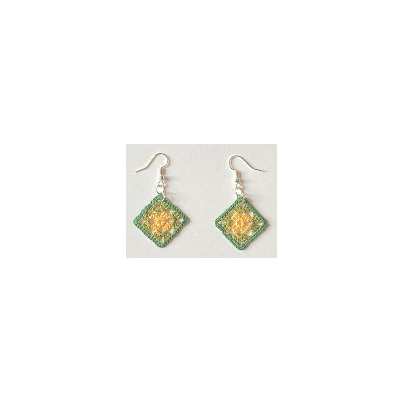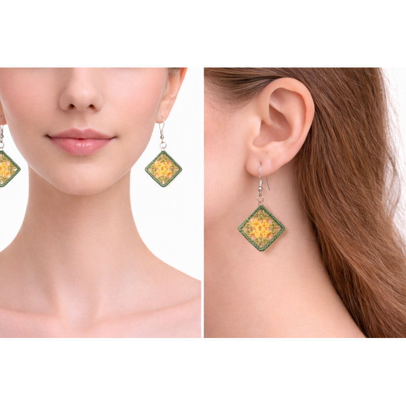 Aurinkoiset ja raikkaat käsin virkatut korvakorut, joissa lämmin keltainen yhdistyy vihreään reunukseen. Neliönmuotoinen virkattu kuvio muistuttaa perinteistä mummon neliötä ja tuo koruihin ihastuttavan käsityön tunnelman. Kevyet ja luonnonläheiset korut sopivat arkeen ja juhlaan, tuoden asuun pirteän väripilkun.