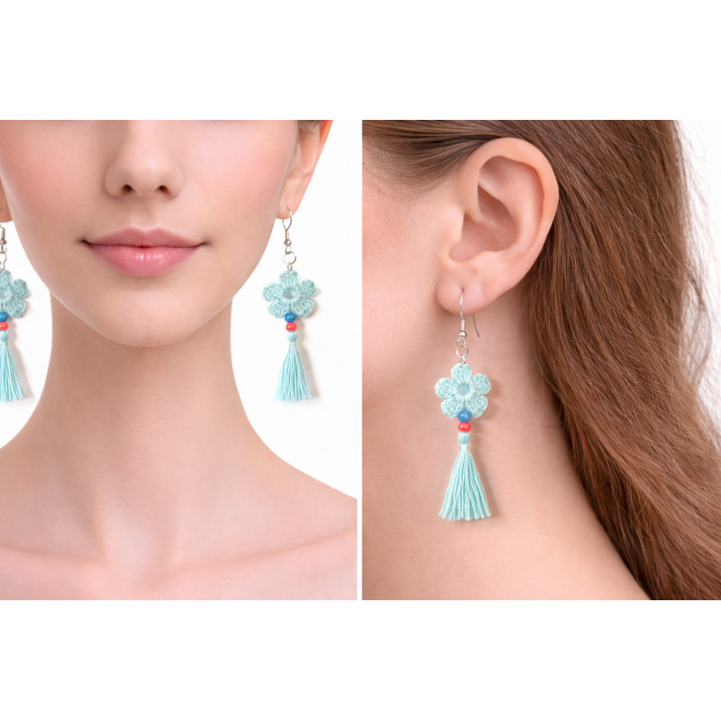 Virkatut kukkakorvakorut tupsulla – mintunvihreä