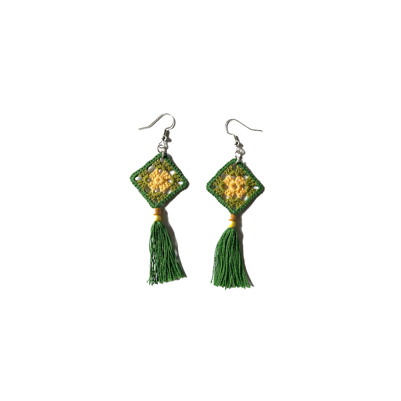 Käsin virkatut korvakorut, joissa aurinkoinen keltainen keskus yhdistyy kirkkaan vihreään reunukseen ja siroon tupsuun. Pieni helmi korostaa virkattua kuviota ja viimeistelee korujen raikkaan ja luonnonläheisen ilmeen. Kevyet ja iloiset korut sopivat täydellisesti arjen piristäjiksi tai juhlan värikkääksi yksityiskohdaksi.