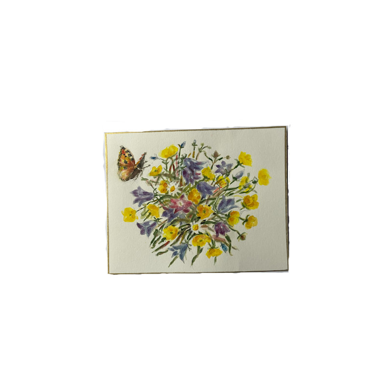 Käsin maalattu kortti – kukkakimppu ja perhonen