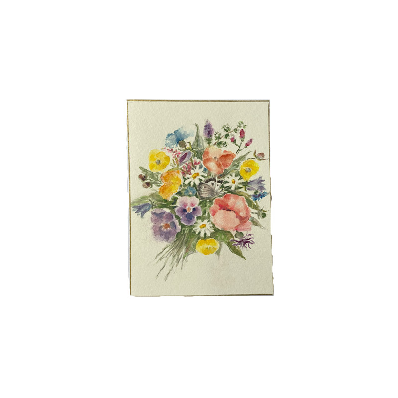 Ihastuttava käsin maalattu kortti, jossa värikäs kukkakimppu loistaa punaisen, keltaisen, violetin ja vihreän sävyissä. Akvarellitekniikka tuo kukkien herkkyyden ja valon kauniisti esiin. Tämä uniikki kortti sopii erinomaisesti onnitteluihin, kiitoskortiksi tai kesäiseksi tervehdykseksi – tai vaikka kehystettäväksi pieneksi tauluksi.