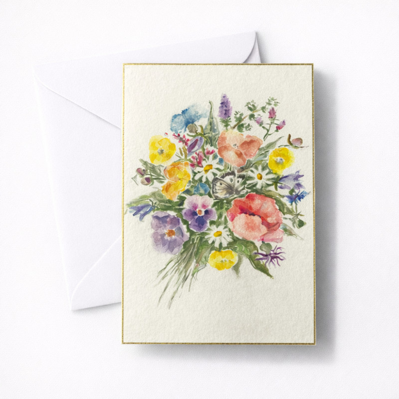 Käsin maalattu kortti – monivärinen kukkakimppu