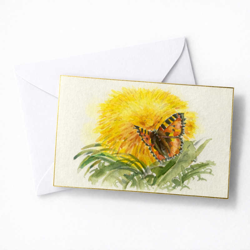 Aurinkoinen ja elämäniloinen käsin maalattu kortti, jossa perhonen lepää keltaisen kukan hehkussa. Akvarellitekniikan pehmeät siveltimenvedot tuovat esiin kesäpäivän valon ja luonnon keveyden. Täydellinen kortti onnitteluihin, kesätervehdyksiin tai ilahduttamaan ystävää – pieni taideteos, joka välittää lämpöä ja iloa.