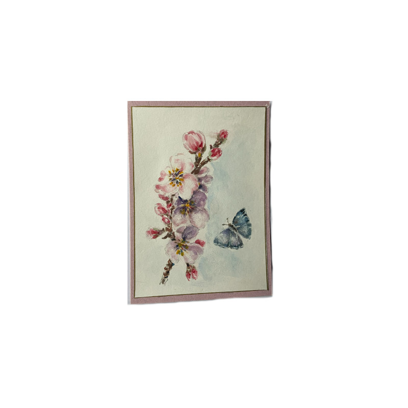 Hento ja kaunis käsin maalattu kortti, jossa keväinen kukkiva oksa kohtaa sinisen perhosen. Akvarellitekniikan läpikuultavat sävyt luovat korttiin herkän ja ilmavan tunnelman. Tämä kortti sopii täydellisesti onnitteluun, tervehdykseen tai ystävälle iloksi – pieni ja uniikki taideteos luonnon kauneudesta.