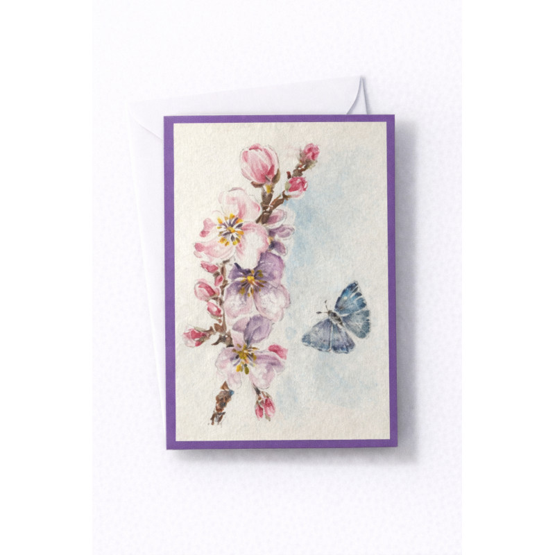 Käsin maalattu kortti – kukkiva oksa ja sininen perhonen