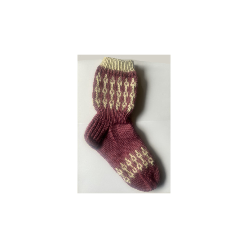 Kauniit käsin neulotut villasukat, joissa lämmin punainen pohjaväri saa seurakseen vaalean koristekuvion. Pehmeä ja lämmin villalanka tekee sukista miellyttävät jalassa ja hengittävät käytössä. Tyylikkäät ja ajattomat sukat sopivat täydellisesti viileisiin päiviin, lahjaksi tai ilahduttamaan omaa arkea.