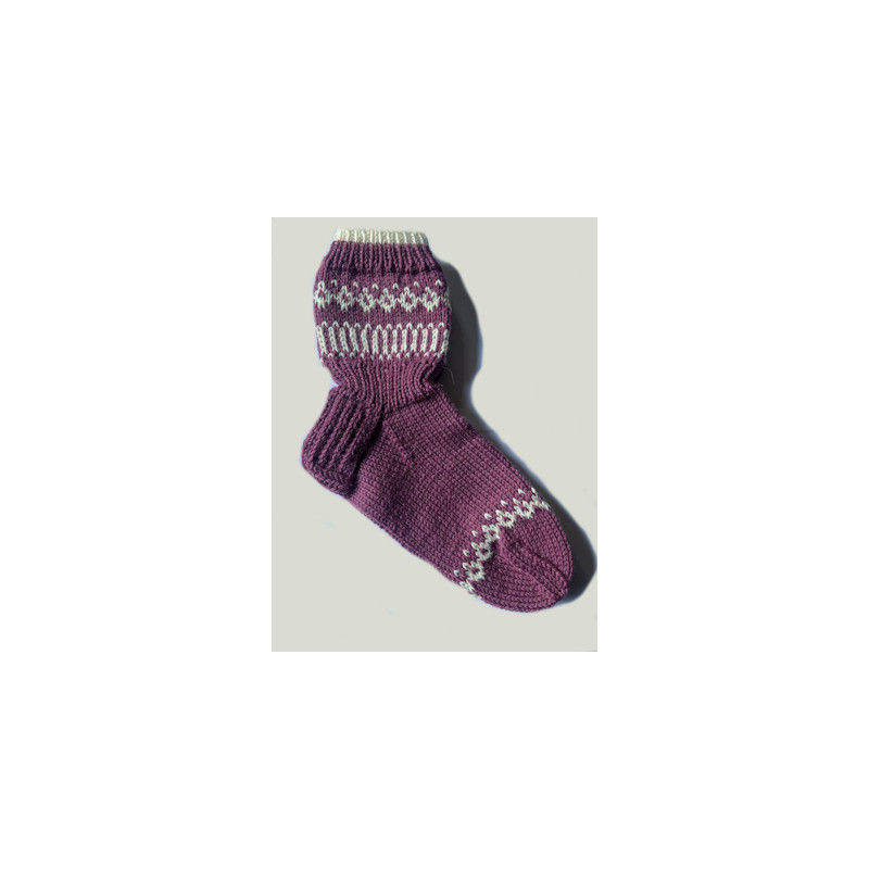 Kauniit ja pehmeät käsin neulotut villasukat, joissa lämmin marjapuuron sävy yhdistyy luonnonvalkoisiin kirjoneulekuvioihin. Sukat on valmistettu huolellisesti laadukkaasta villalangasta, joka hengittää ja pitää jalat miellyttävän lämpiminä. Näissä sukissa yhdistyy perinteinen käsityötaito ja harmoninen värimaailma – täydelliset viileisiin iltoihin tai lahjaksi läheiselle.