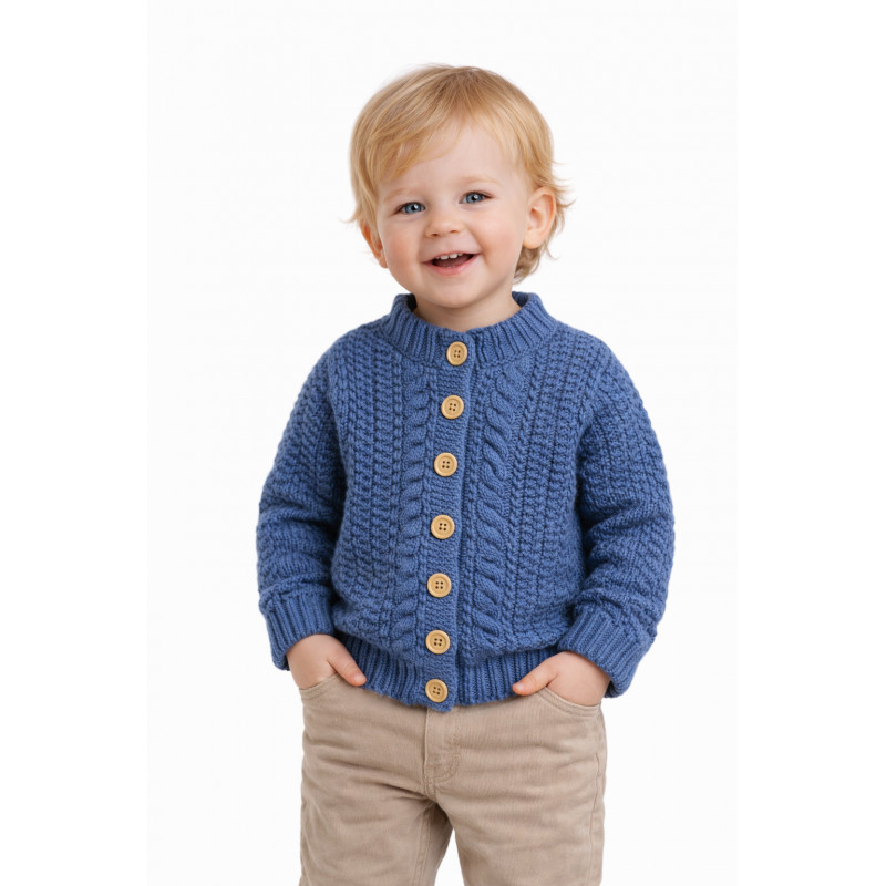 Vahvan sininen hengittävä ja pehmeä villatakki, valmistettu käsin 100 % villaisesta Merinovillalangasta. Lanka on kevyt ja miellyttävä ihoa vasten, mikä tekee siitä erinomaisen valinnan lapsen herkälle iholle.