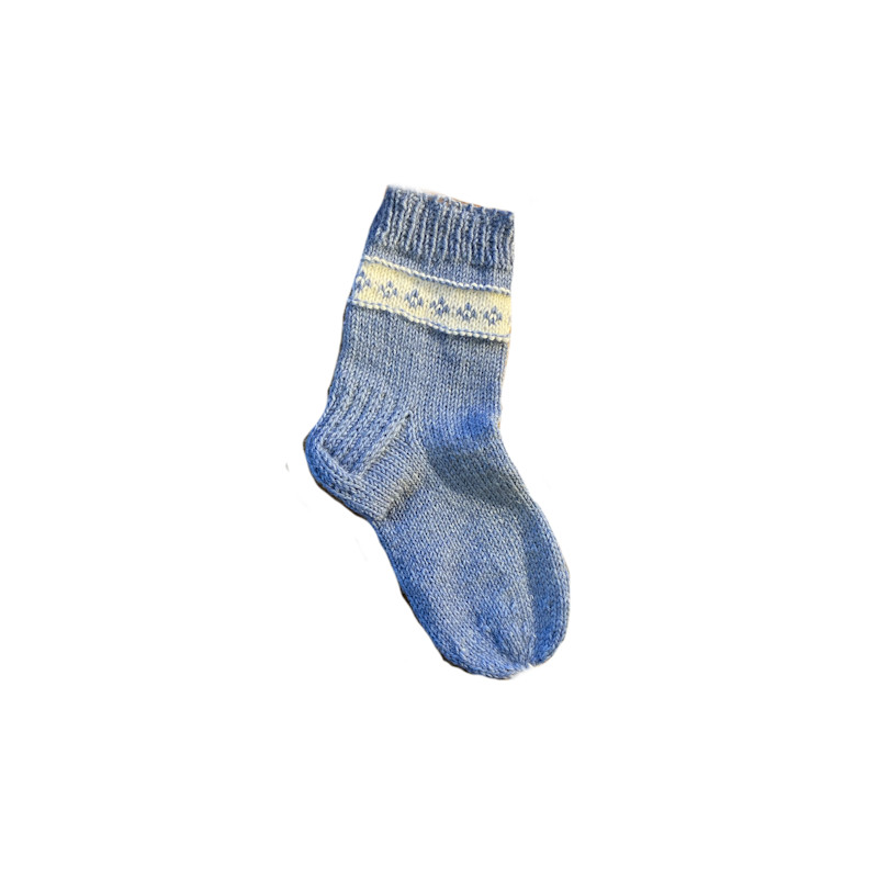 Nämä hennon vaaleansiniset villasukat on neulottu suomalaisena käsityönä, ja niissä yhdistyvät pehmeä villa, perinteinen neulemalli ja kauniit yksityiskohdat. Varren vaalea kuviollinen raita tuo sukkiin valoisan ja herkästi erottuvan koristeen, joka sopii kaikenikäisille käyttäjille.