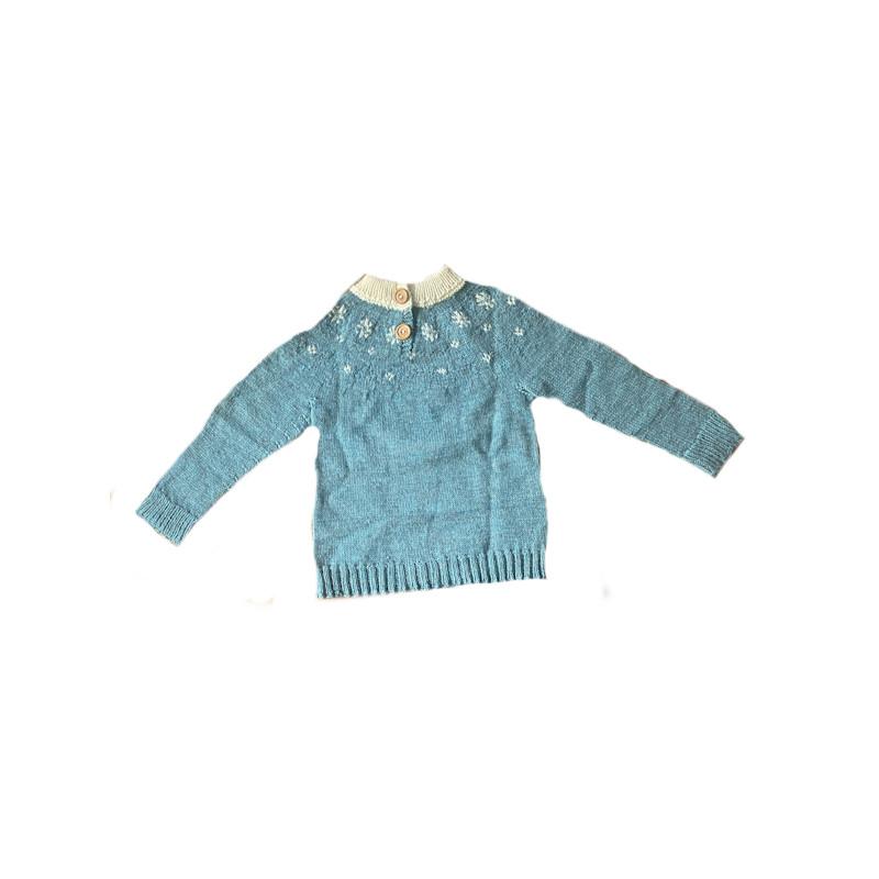Tämä käsinneulottu lasten villapaita on tehty pehmeästä ja lämpimästä villalangasta pienen käyttäjän mukavuutta ajatellen. Kaunis turkoosinsininen sävy on ajaton ja helppo yhdistää arjen asuihin. Villa hengittää luonnostaan, joten paita lämmittää ilman hiostamista.