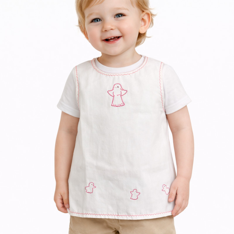 Tämä herkkä lasten esiliina on kaunis esimerkki siitä, miten kierrätysmateriaali voi saada aivan uuden elämän. Kangas on peräisin kierrätetystä puuvillatekstiilistä – puhtaasta, laadukkaasta ja kestävän kehityksen mukaisesta materiaalista, joka ansaitsi vielä uuden tarinan.