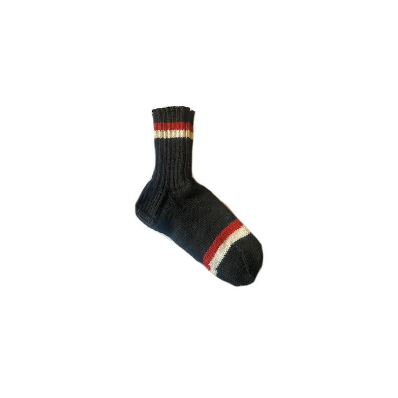 Käsinneulotut villasukat – mustat, punainen ja valkoinen raita