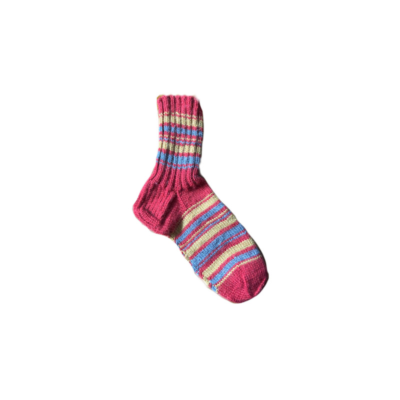 Piristävän värikkäät käsin neulotut villasukat, joissa punainen pohjaväri saa seurakseen raikkaat vaaleankeltaiset ja siniset raidat. Sukat on valmistettu pehmeästä ja lämpimästä villalangasta, joka hengittää ja pitää jalat mukavina viileinäkin päivinä. Iloinen väriyhdistelmä tekee näistä sukista täydellisen lahjan tai oman arjen ilahduttajan.